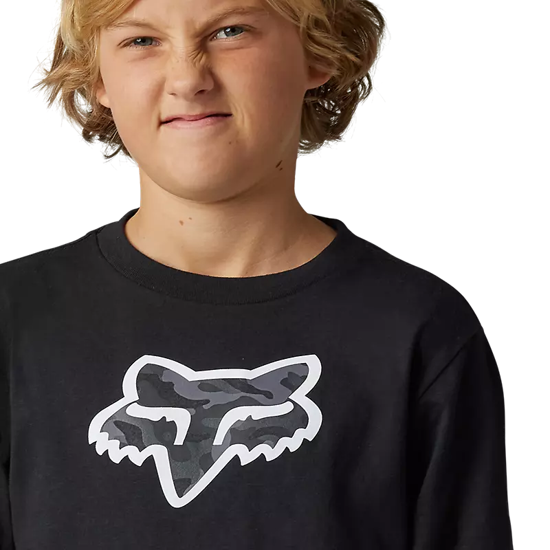 The Youth Vzns Camo Long Sleeve Tee combines classic Fox style with supreme comfort and a fun camo flavor. Midweight and soft, this comfy tee is sure to become an instant fav in their daily t-shirt rotation.